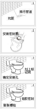 一、座便器安装注意事项: 1、本产品禁止用水泥安装,否则水泥的凝结膨胀可能挤破瓷体。 2、建议用玻璃胶安装。(如果采用混合沙浆安装,建议使用水泥标号325#,水泥、石灰、砂比 例为:1:1.7:11.5的混合沙浆 3、座便器的排污口不能自行加大。 4、座便器要确保水平,底部不能安置存水弯,否则会影响冲水功能。 5、严禁向便器内丢入新闻纸、纸尿垫、妇用卫生巾等易堵物品。 6、若用玻璃胶安装,应待玻璃胶固化后方可试冲水。 7、若用混合沙浆安装,安装完毕应试冲水三次,防止排污口水泥凝固而影响冲水功能。 二、座便器的安装步骤: 1、安装前应检查排污管道是否畅通及安装地面的清洁。 2、将配套的密封圈安装在座便器的排污口上。 3、确定座便器安装位置。将座便器(排污口)对准管道下水口慢慢放下, 调整正确位置,然后(用粉笔或白板笔)在座便器的四周划上标记线, 并确定安装孔。 4、打安装孔。对准地脚镙丝标记孔,用冲击钻打安装孔(直径为10㎜,深 度为60㎜),装入膨胀胶钉。(一般不须安装地脚镙丝) 5、在标记线内侧打上玻璃胶。 6、对准安装孔及四周的玻璃胶装上座便器,慢慢地向下压直到水平。 7、在座便器与地面连接处打上玻璃胶,并修整四周确保美观。 8、安装地脚镙丝。 9、连接进水管,检查过滤器是否有安装。 10、清洁地面和工具,禁止立即使用(玻璃胶固化一般需要24小时),保持座便器周边24小时内不接触水。